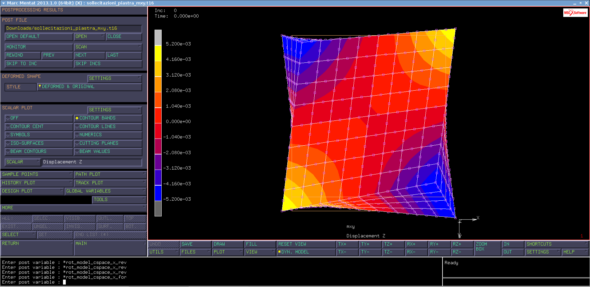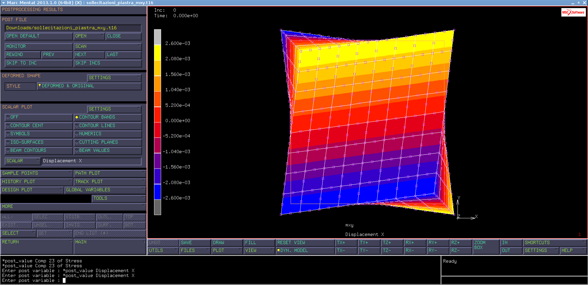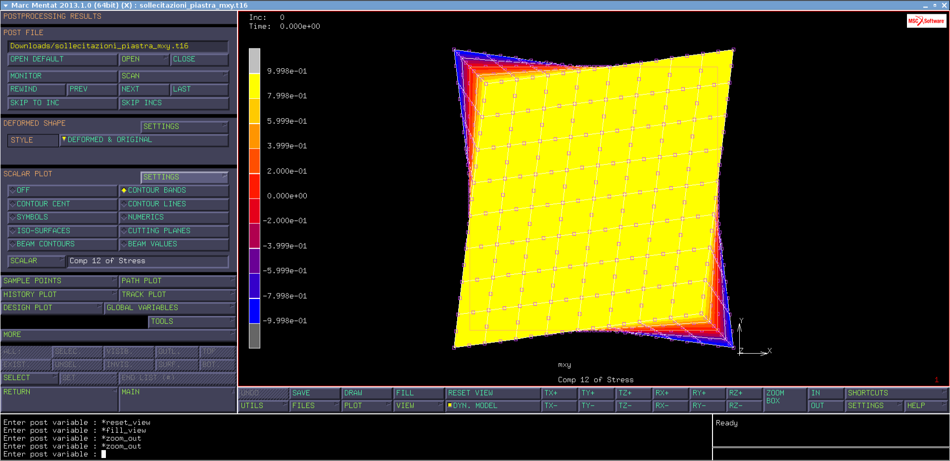 Si vuole analizzare lo studio relativo al momento torcente su piastra piana attraverso l’utilizzo del software Marc-Mentat. Dal portale Wiki scarico il file “Sollecitazioni piastra” e “Caricamento e scaricamento elastoplastico tubo”. Avvio Marc-Mentat da terminale e visualizzo il file della piastra tramite i seguenti comandi: