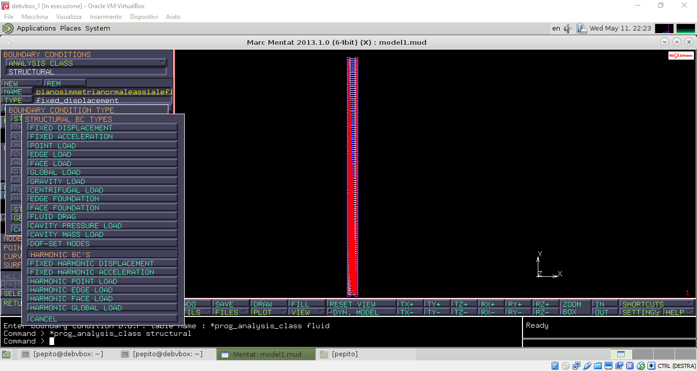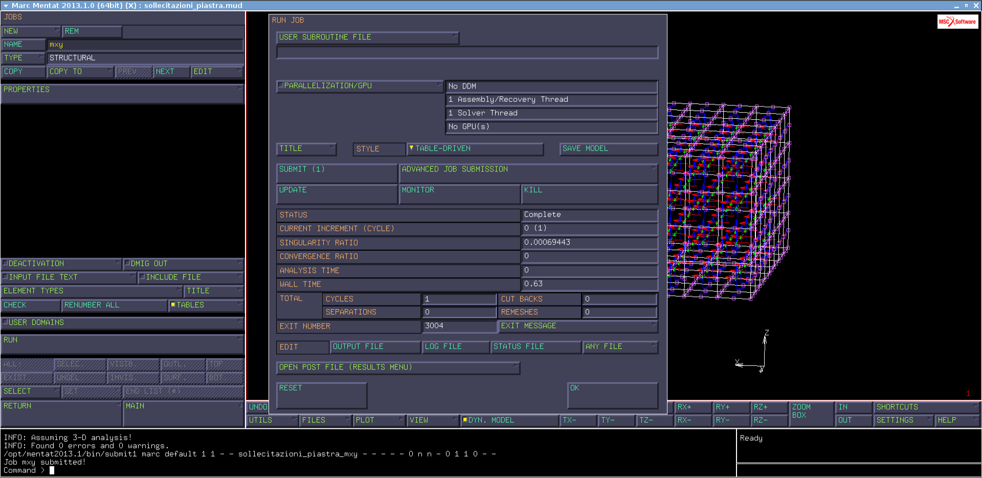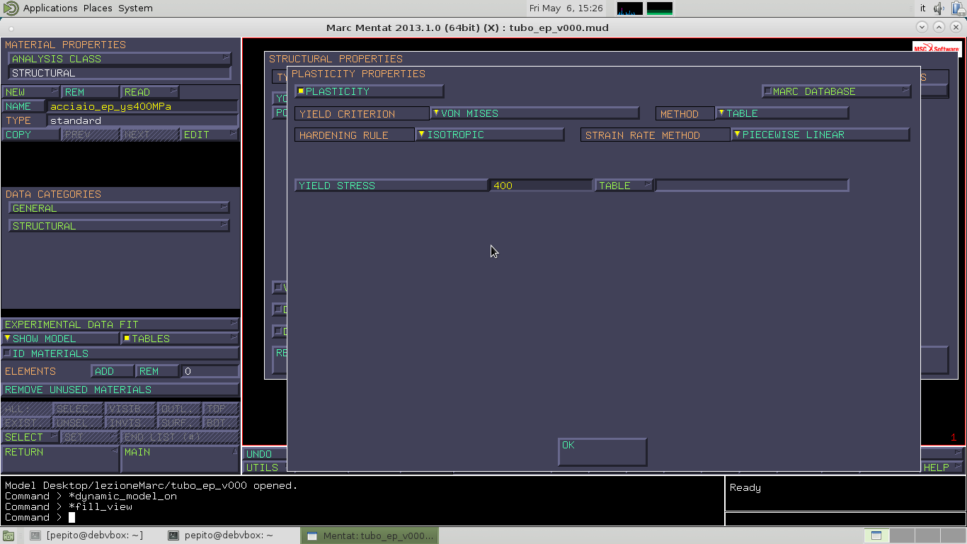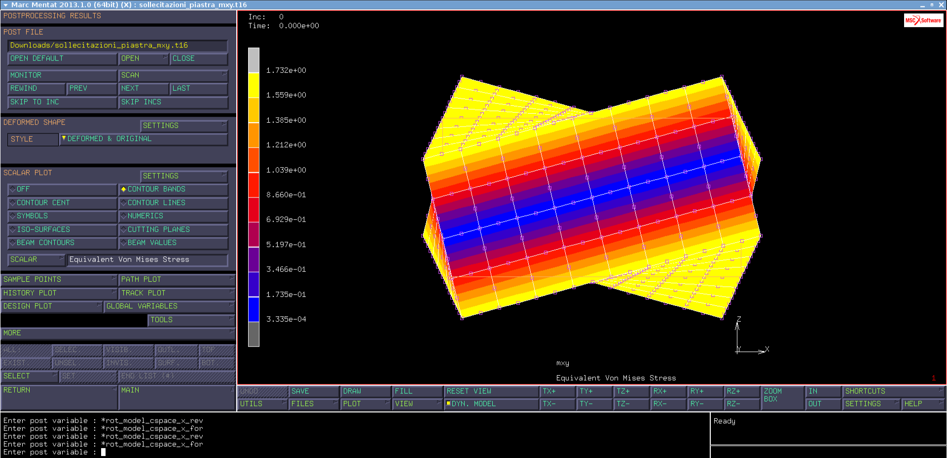 Si vuole analizzare lo studio relativo al momento torcente su piastra piana attraverso l’utilizzo del software Marc-Mentat. Dal portale Wiki scarico il file “Sollecitazioni piastra” e “Caricamento e scaricamento elastoplastico tubo”. Avvio Marc-Mentat da terminale e visualizzo il file della piastra tramite i seguenti comandi: