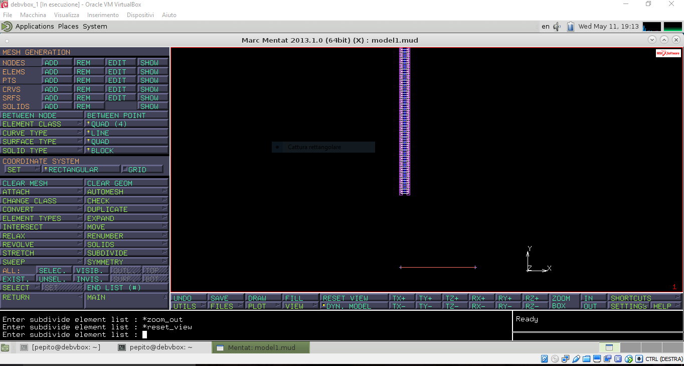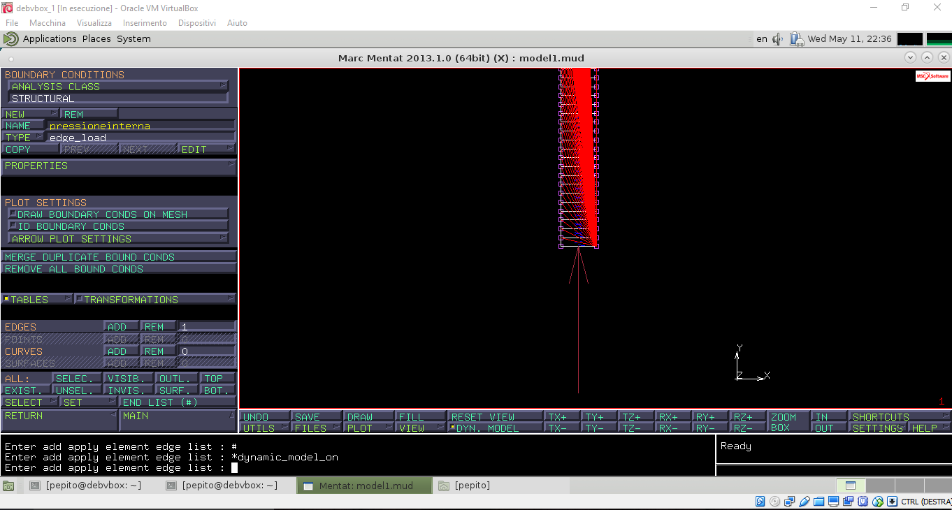 Errore tipico riscontrato a lezione è ERROR 13: andare su MATERIAL PROPERTIES e controllare di aver inserito il valore del modulo di Young (pari a 1000) e di averlo applicato a tutta la struttura. Altrimenti cercare un errore di sintassi nel file di input del solutore: andare sulla cartella di lavoro: APPLICAZIONI – SYSTEM TOOL- FILE BROWSER e si trovano due file. Il file con estensione .dat è il file di input del solutore mentre il file con estensione .out è quello che contiene il diario dettagliato di calcolo. Apro il file .out con un visualizzatore di testo (ad esempio GEDIT) e cerco ERROR nella casella SEARCH. In questo modo trovo il motivo del messaggio ERROR.