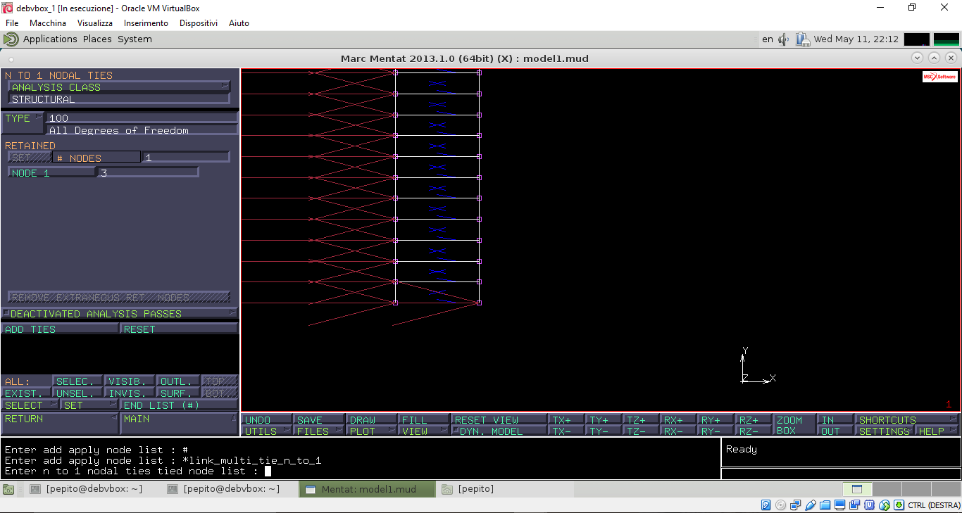 guardando la figura sul piano xy → ADD TIES prendo con una sezione rettangolare tutti i nodi tranne l'ultimo,